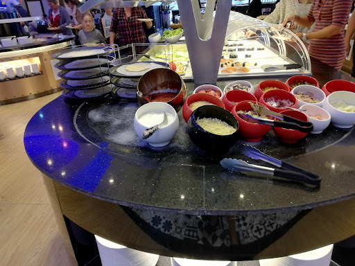 On est dans une ambiance aquatique assez sympa, le service est rapide (pour les boissons). On se sert nous-même pour les plats, les viandes, les fromages et les desserts.