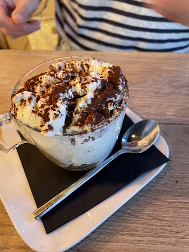 Nous nous sommes également laisser tenter par un dessert, j'ai pris un "café fantaisie" (c'est un café gourmand). Dans ce dernier, il avait une pana cotta avec un coulis framboise, un tiramisù café, un biscuit italien, un baba au limoncello et une crème glacé à la pistache, tout était très très bon, vraiment excellent, surtout la crème glacé à la pistache, à tel point que j'en ai redemandé, j'insiste vraiment sur le goût de cette crème glacé, un VÉRITABLE goût de pistache, une tuerie!