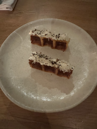 Coming to the most important part, the food: The 1st Amuse was my highlight. A simple, but extremely tasty combination of an unsweetened waffle, with a cream of Comte. Loved it. Followed by a red beet cream with sour elements. The first dish were scallops, also very well made. Next up was lamb, in a homemade ravioli and in a more classic form. It was accompanied by topinambur and potatoes. Now it was cheese time, and we had an amazing Brie with fresh truffle. As desert there was an excellent sorbet.