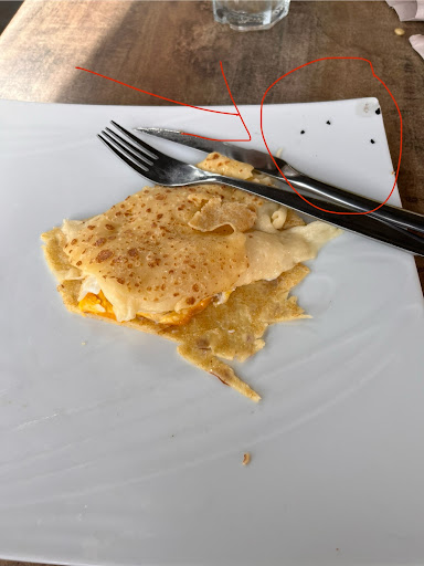 Que lâaccueil ne soit pas chaleureux est une chose, que lâon parle de galette au lieu de crĂȘpe (mĂȘme si on pourrait sâattendre Ă ce que dans la restauration, on connaisse la diffĂ©renceâŠ) en est une autre mais alors quâil y ait des bouts de TĂ©flon (fond de poĂȘle) DANS une crĂȘpe au fromage et Ă lâĆuf est un comble ! Il serait bien de changer de poĂȘle avant dâempoisonner les clients avec des bouts de TĂ©flon⊠(oui ce nâest pas comestible + cancĂ©rigĂšne !!) comme vous pouvez le voir sur la photo ci jointe, il y avait pas mal de bouts noirs et durs (jâen ai jetĂ© certains et ce nâĂ©tait pas de la nourriture) dans une crĂȘpe oĂč rien ne devait ĂȘtre noir. Donc de deux choses lâune, soit la casserole Ă©tait sale, soit elle sâeffrite et vous servez des bouts de casserole aux clientsâŠ. De toute Ă©vidence ces morceaux nâavaient rien Ă faire dans une crĂȘpe au fromage et Ă lâĆuf.