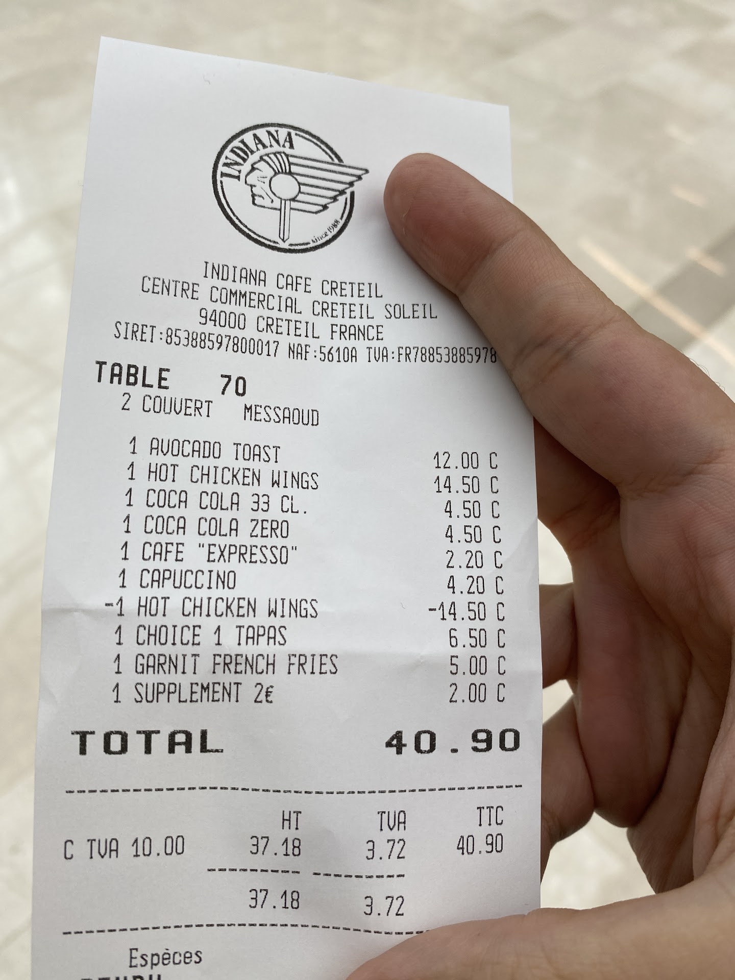 Je recommande vivement à la direction d'Indiana café de prendre des mesures correctives immédiates, notamment en convoquant le serveur concerné pour une enquête interne approfondie. L'attitude déplacée et l'inefficacité manifeste de ce membre du personnel ne sont pas dignes d'un établissement de votre renommée.