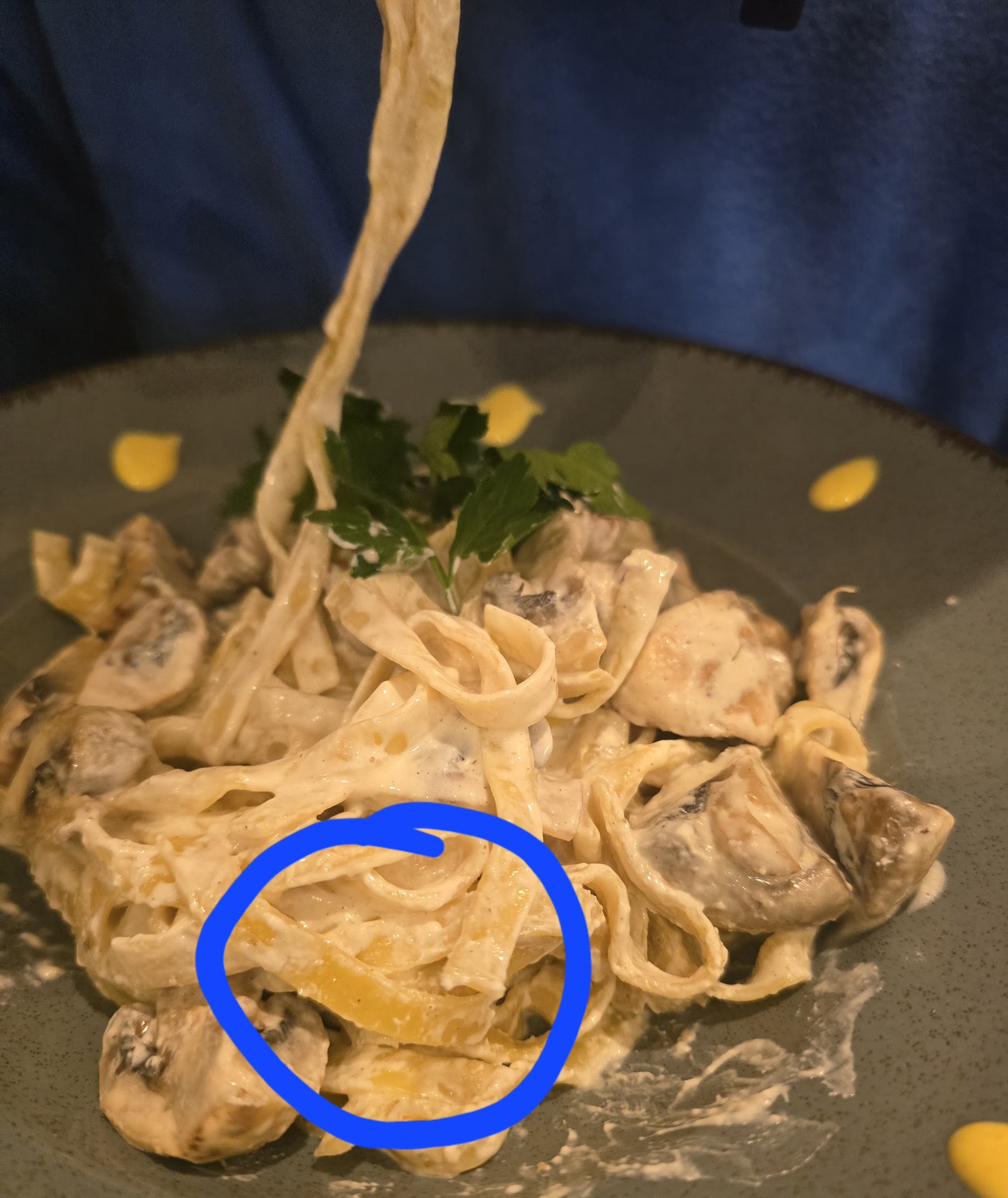 Et pendant tout ce temps, la serveuse qui avait pris notre commande évitait complètement notre table, ne nous regardait même pas. Nous avons dû demander à un autre serveur pour avoir un peu de pain, car il n’y avait qu’un petit morceau sur la table. Et quand les pâtes sont enfin arrivées, elles étaient ni chaudes ni froides, clairement laissées de côté trop longtemps, avec les bords complètement secs.