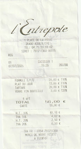 Attention à la dame aux tatouages ! Nous avions réservé avec ma compagne pour prendre 2 formules Entrée, plat, dessert à 20€. Mais la formule, il n'y avait plus ce qui était indiqué. Bon, la dame nous propose à la place un tartare de boeuf, super ! Du coup, je prends un plat du jour + un verre de vin. Mais au moment de l'addition, je m'attendais 20€+20€+3€ = 43€! Eh ben non, la dame nous a compté le tartare à 20€ en supplément alors que c'était à la place du plat qui n'était plus dispo + 20€ de la formule + 13€ du plat du jour + 3€ du verre de vin= Total 56€ au lieu des 43 du départ! Alors attention, si on vous propose " à la place", demandez bien si c'est en supplément ! On n'est pas loin de l'arnaque ! Mais la cuisine est bonne ! Si certains menus ne sont servis qu’à certaines heures de la journée, cela doit être indiqué (Article 4_Arrêté du 27 mars 1987 modifié par l’arrêté du 29 juin 1990). Vous...