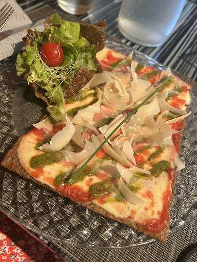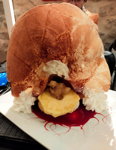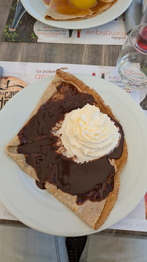 Great salty pancakes (crêpe de froment), some unusual but very tasty toppings possible and superbe sweet crêpes! Fun presentation too, like your salad bowl is actually made out of edible croustillant crêpe. Service is friendly and fast. The place is traditional. Parking just across the road. Terrace is at the road but that's not of concern once you tasted the crêpes. We had a Galette Mimosa and a crêpe avec chocolat et crème chantilly fait MAISON! And a crêpe with caramelised pêche 🍑 au...