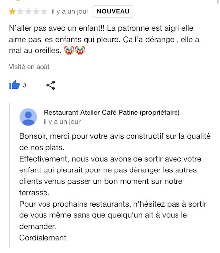 On aurait dû s’en douter lorsqu’on a demandé des chaises haute et qu’il y en avait pas ou alors, lorsqu’on est arrivé et qu’il n’y avait pas de place pour les poussettes ( elles devaient remplacer les chaises haute).