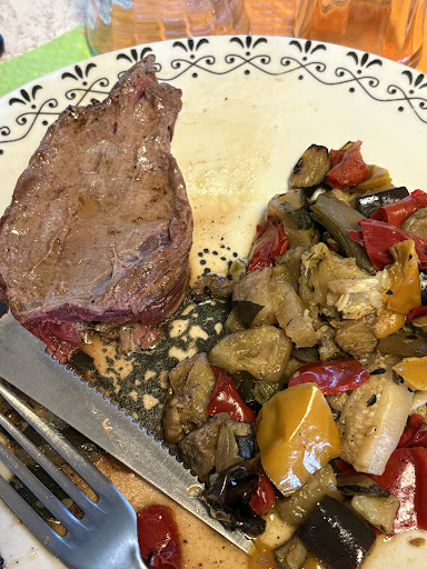 Des mon installation, la dame m’a ramené un plateau de charcuterie, ni bons ni mauvais. Mais attention le plat : Bavette, légumes