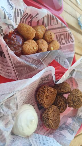 Bier im Plastik Becher đ¶ warum macht man sowas? Wir hatten verschiedene Sachen und 2 GetrĂ€nke fĂŒr stolze 49 Euro đ€ Okay wenn es denn schmeckt ist das ja okay aber leider war es nichts tolles, Falafel so hart frittiert das man sie kaum essen konnte, jalapeno KĂ€se BĂ€llchen waren ohne Geschmack, Burger hatte keine SoĂe und war etwas matschig durch das viele Fett und Fisch und Chips war halt wie erwartet đ