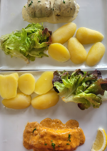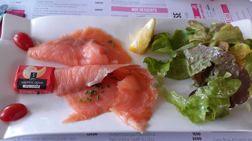 Read moreTrès décevant ! Le poisson était trop cuit et sec, peu généreux en frites. Nous avons mangé tout le pain car nous avions encore faim. De plus, il était écrit sur le menu qu'avec la formule du jour plat + dessert, on avait le choix parmi tous les desserts de la carte sauf crêpe et gaufres. Je demande un café gourmand, et on m'informe qu'il y a un supplément de 2,50€ alors qu'à la carte, le prix du café gourmand n'est supérieur aux autres desserts que de 50 centimes. Lorsque nous demandons pourquoi à la serveuse, celle-ci nous répond que c'est parce qu'il n'est pas compris avec le menu. Ok mais pourquoi un supplément aussi élevé ? On n'a toujours pas compris. Le pain perdu (spécialité du chef, fait maison d'après la carte) ressemble à du pain de mie industriel pré-tranché... Bref, carte pas claire, plats décevants, et accueil qui...