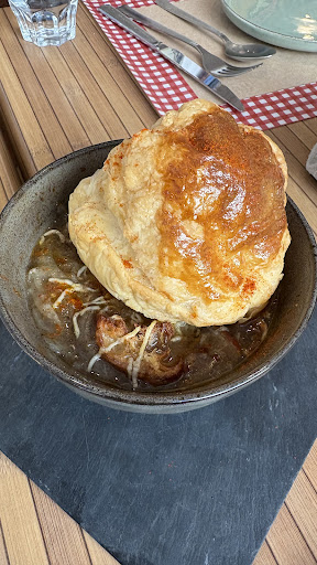 I post very rarely, but it felt unfair that this place enjoys such a high rating while the food is just terrible. The rating is very confusing for 1st time visitors like 99% of the customers here, I guess, since the village is very touristy, locals wouldn't eat here. I took a linguini vongole and my wife a cucumber gazpacho. I know it's a bad idea to take pasta / Italian in France, it's almost guaranteed it would be bad, but I gave it a try, as the place was so highly rated. My wife couldn't even finish her gazpacho, so bad it was. I left more than half of my portion of pasta, it wasn't really disgusting, but simply tasteless, such a shame for a 20+ Euro dish in such a simple cafe place. The linguini were broken before being cooked (typical French way, it seems), so you can't roll them on your fork aside from general aesthetics of the dish, slightly overcooked, tasted very plain, means that after cooking they were not simmered / tossed in a frying pan with the sauce / other ingredients before being served. The restaurant was only serving linguini, gazpacho and burgers, nothing else, nothing local, i.e. just the catchy popular international dishes aimed to draw tourists' attention. They didn't really care that they have no idea how to cook it, they should rather concentrate on what they know how to cook, there is a number of great recipes in France too! A typical tourist trap.. The service was ok though, the atmosphere no different from any other place around...