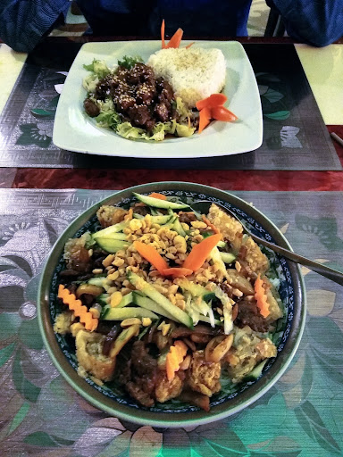 Our entrées were delicious. The crepe de riz vapeur and the salade de boeuf grillé were fantastic, we were thrilled. Riz cantonais was good. My wife's shrimp a l'ail cuit vapeur was good.