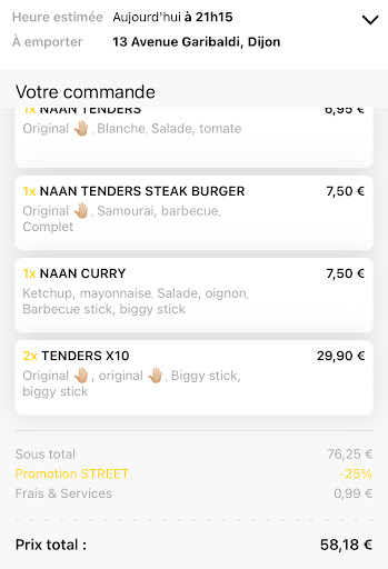 1Ăšre et derniĂšre fois. En recommandation des rĂ©seaux sociaux tels que insta, tik tok, etc⊠je telecharge lâappli faisant bĂ©nĂ©ficier de 25% sur le total Ă emporter ou sur place. Je passe ma commande pour un total de 58⏠au lieu de 76âŹ, paiement en espĂšce au restaurant. Ravie, je me prĂ©sente sur place pour payer et rĂ©cupĂ©rer ma commande et mauvaise surprise, le jeune homme au comptoir ne voit pas de quoi il sâagit, pas de commande en cours, tout le personnel me dit que câest la 1ere fois quâils tombent sur cette situation de commande via lâappli et pourtant je leur prouve bien que câest lâadresse de leur restaurant. TrĂšs déçue car aucune de ces personnes nâa essayĂ© de trouver de solutions sauf le jeune homme qui a demandĂ© au cuisinier sâil ne serait pas prĂ©fĂ©rable dâappeler le responsable et la seule rĂ©ponse a Ă©tĂ© : non ça sert Ă rien, de toute façon il ne pourra rien faire, en gros soit vous passer commande, soit ciao. Je dĂ©cide tout de mĂȘme de rester sur ma commande car il Ă©tait tard et mes enfants avaient faim et voulait absolument tester Chicken street. NâĂ©tant pas une cliente Ă faire des scandales mais dans ces cas lĂ , pour avoir maintenu ma commande de 76⏠pour une erreur qui nâĂ©tait pas mienne, il nây a eu aucun geste commercial, jâaurai tout de mĂȘme pensĂ© quâils auraient offert ne serait-ce quâune boisson ou un dessert mais rien. Hyper déçue, câest clair que je nây retournerai pas rien que pour ça. Pas pro, publicitĂ© mensongĂšre et pas commercial du tout. Retirer votre adresse sur lâappli et si erreur, faire un geste commercial au client est la moindre des choses. Pour ma 1ere expĂ©rience chez Chicken Street, celle ci me reste bien en travers...