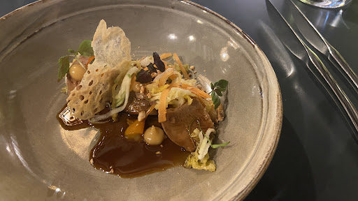 Read moreUne excellente cuisine raffinée, et goûteuse. Les Proportions sont petites mais avec un service en 5 services on est bien calé. Bon vin aussi. Par contre, et j’espère que c’est isolé , le service de ce soir n’était pas à la hauteur de mes attentes … je n’ai pas pu profité de mon dîner comme je l’aurais souhaité … j’ai senti le serveur tendu tout au long du service, speed ou pas dans son assiette. Pour l’entrée il nous a servi un p’tit bout de pain ( 2 bouchées ) , et quand on a demandé un autre pour finir de saucer, il nous l’a refusé !! ça m’a refroidi pour toute la soirée . Il a expliqué que le pain est fait maison et les tranches sont comptées en fonction des réservations… mais il n’a pas proposé un autre pain non fait maison !!! Pour moi c’était hallucinant et juste désagréable et pas accueillant de dire ça aux clients . C’est du jamais vu . Sans parler qu à la réservation, j’ai signalé qu on dînait pour l’anniversaire de mon partenaire, le Mr au tél a proposé un mot ou une inscription sur son dessert … mais on a rien eu , peut être par oubli … mais ça reste non professionnel et décevant encore . Et pour couronner le tout , notre table « la plus proche des cuisines » est à déconseiller… on voyait par la vitre les échanges qui étaient tendus entre le personnel , la porte battante qui fait du bruit sursautant à chaque sortie et entrée du serveur et des commis qui sortent chercher des boites du sous sol , le bruit de la raclette qui tapait sur la porte qd le personnel a commencé le ménage à 22h . On a caillé de froid qd le personnel ne fermait pas la porte en allant sur le SAS … bref très très bonne cuisine mais gâchée par ces multiples...