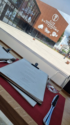 Le Comptoir de la Cité, c'est la première offre visible de restauration de la Cité de la gastronomie. Il occupe une position géographiquement "dominante", en vitrine sur le parvis. Nous étions 2 personnes pour le déjeuner, tous deux d'origine dijonnaise, venant à la Cité pour la première fois. C'est le souvenir du "Poulet Gaston Gérard", en bonne place sur la carte, qui nous a incité à opter pour cet établissement plutôt que pour un autre point de restauration de la Cité. Une seule visite, deux plats, deux desserts identiques... cet avis, comme tous, doit donc être relativisé ; néanmoins... Arrivés à 13h30, nous sommes installés rapidement. Le confort est d'emblée rudimentaire : mobilier basique, petites tables très proches les unes des autres, très proches du comptoir. L'ambiance est bruyante (conversations des tables voisines - va et vient incessant du personnel peu discret - bruits de cuisine, conversations de service derrière le comptoir - maladresse d'une serveuse aux tables voisines, bouteille de coca rebondissant et cassant). La carte ; enfin, les 3 ou 4 feuilles à peine propres qui nous sont présentées à l'installation, ne correspondent, ni en nature des plats, ni en prix, à celle téléchargeable sur le site. La commande est prise rapidement par une serveuse cordiale. Le premier plat est servi rapidement par un serveur à l'élocution si précipitée, qu'il est difficilement intelligible. Le verre de Mâcon blanc vieilles vignes 2022 est servi rempli, sans présentation de la bouteille. Est-ce bien celui commandé ? Peut-être... Je suis surpris au moment de régler l'addition : c'est un verre de vin rouge qui est facturé !? "C'est le même prix" me dit-on... Les desserts et les cafés commandés n'arrivant pas après un délai conséquent suivant la desserte du premier plat, il est nécessaire d'interpeler un serveur et de passer à nouveau la commande. LE Poulet Gaston Gérard est si "revisité" qu'il est méconnaissable : où est le comté ? où est le vin blanc ? paprika trop là, émincé trop "anonyme" qui pourrait laisser des doutes et des craintes sur l'origine de la bête, du coup, où est le croustillant de la peau dorée ? ... La Coupe de fruits de saison et crumble de pain d'épices : une gageure les "fruits de saison" en avril ! Raisin, clémentine, fruit de la passion, pomme... crumble pain d'épice, petite idée agréable. Je tenterai peut-être une seconde visite dans cet établissement, juste afin de me rendre compte si ce 10 avril 2024 n'était qu'un "mauvais jour", à moins que ce soit le "concept bistrot-comptoir" qui ne me convienne vraiment pas ? Quant au Poulet Gaston Gérard - non, il n'a pas besoin de "revisite". Bon, question alimentation servie, on en a grosso-modo pour ses 24 €, mais, il est encore possible de trouver des adresses toutes simples, proposant une cuisine de produits de qualité soignée, à des prix similaires, ne prétendant pas à un label "gastronomique" et offrant un accueil bien plus confortable. J'oubliais, on nous a offert les cafés - merci...
