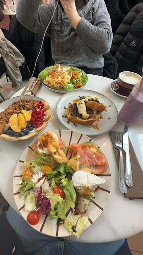 Read moreNous avons pris deux chocolats chauds servis tiède, deux plats salés et un plat sucré. Note totale 57e. Pour avoir déjà fait des brunchs de ce genre au même prix dans d’autres villes (Barcelone par exemple) les assiettes avaient un tout autre genre : assiette travaillées cuisinées maison avec des produits locaux et de qualités . Rien à redire sur les pancakes : ils étaient vraiment bons. Bémol, il manquait de la garniture ( je regrette de ne pas avoir pris le saumon, la dinde ne ressemblait pas à de la dinde) deux feuilles de salade se battaient en duel victoire de la demie tomate cerise. (j’avais vraiment qu’une demie tomate cerise) Les œufs Bénédicte qui n’étaient pas coulant du tout. (Et certainement achetés chez Metro vu la forme très très homogène qu’ils avaient). Vraiment dommage pour le prix j’aurai apprécié avoir plus de qualité (du fait maison) et de travail dans l’assiette. Pour la brioche perdue je ne sais pas quoi vraiment dire. (Sauce caramel pas maison des pépites de chocolat sans grande saveur).
