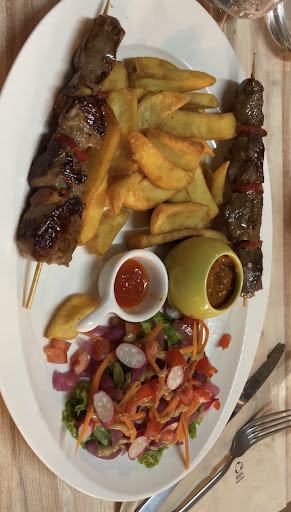 We have been traveling through UK, Northern Italy and Eastern France for a month - coming from Australia. So now, we are in Dijon for a few days to discover Burgundy and want a casual dinner that’s not rich Bourgogne cuisine for a change (though we love that too). We are staying near Rue Berbisey and want something near home. Palais Maasaï comes up on Google maps with great Google reviews highlighting delicious food and not-fancy but very friendly hospitality. We’ve eaten various African countries’ cuisines at home in Australia before, so are excited. We walk in the door and are a little confused by the quasi-nightclub vibe of this very small restaurant. Is it a bar or a restaurant? The owner seems a bit confused that we have walked in, early on a Saturday night. He explains the menu and we say, “we have a 20-25 euro per head budget, can you please feed us your recommendations”. The feast that ensued was magnificent and came with keen explanations - the owner is from Burundi but takes inspiration from East, West and Southern African regions. We had chunky marinated beef skewers BBQ-ed, delicious prawns/shrimp that you can eat whole - not peeling, mouthwatering plantains and samosa with a delicious chilli sauce and fries, a mafé with brown rice that was deep and rich and - at our specific request, even though it’s mid summer - fufu with a gorgeous beef stew that was just delightful. We had a very reasonably priced South African red wine and a couple of very well-made cocktails. We spent 120 euros all up for the 4 of us (the owner was careful to explain up front that the bottle of wine would be above our budget, which we happily accepted). Best of all was our cheerful host who did everything - making cocktails, cooking the food, serving, chatting. I felt like I was a guest in his home. I read that in another review that service was a bit slow. Sure, don’t expect to eat here in a hurry, this is a family meal experience. We left the restaurant full of food, tipsy from wine and nourished from hospitality. I give Palais Maasaï a Michelin star for a wonderful, casual, unexpected, delicious, and welcoming night...
