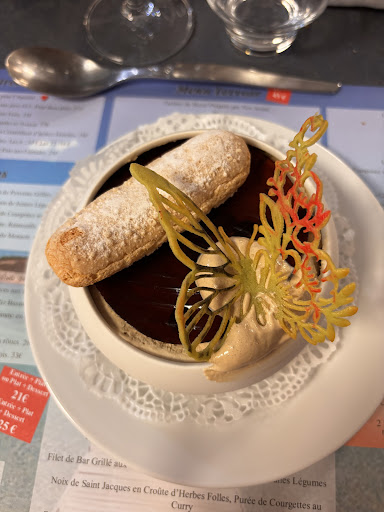Relégués au Bar (admettons , il en faut ) , Plats très quelconques pour l’occasion et mini mini parts ( admettons) . Morceaux de verre trouvés dans les chocolats de Pâques - poliment signalés et montrés au serveur par la victime- ( réponse : je ne suis pas dedans ??? ) . Inadmissible ! Et le « Clou » pour les 2 desserts : bougies ( acceptées avec plaisir ) : . J’avais expressément demandé de la discrétion - rien d’autre que les bougies à cause du jeune homme très réservé qui avait apprécié ma demande dont il a été témoin ….. et là une Musique de P. Sébastien tonitruante a envahi le Bar et tous les regards se sont tournés vers nous et mon invité , décontenancé , a quitté la table et est sorti jusqu’au retour du calme .