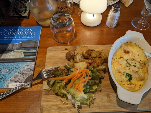 Read moreVinimos a este restaurante guiados por sus buenas opiniones. Pero salimos defraudados. La lasaña de verdura, no tiene nada de especial. “Les brochetas" son tostadas de pan, sin más. Los platos son diminutos, y eso que somos personas que comemos poco. Las mesas exteriores están al sol, así que nos sentamos dentro, pero dentro hacía un calor infernal, porque tienen los hornos funcionando, y no tienen aire acondicionado ni ventilador. Comimos sudando. La chica se veía estresada, resoplando, y antipática. No hablaba inglés, y ni siquiera hizo el esfuerzo por entendernos. Y sabiendo que no hablábamos francés, seguía hablándonos en francés, como si tuviésemos la obligación de entenderla. Una falta total de respeto. No volvería, ni por la comida ni por el trato. Sin duda, el peor restaurante de nuestro viaje por la Bretaña Francesa. Ah! Y no...