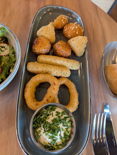 Loved every bit of the starters that we tried. Glad we went with the small option of the fried cheese starter. It was plenty between the two of us. My husband enjoyed his burger. You can choose how you would like your burger to be cooked which was quite good. As for my caesar salad, I would have enjoyed more if it was romaine lettuce instead. However, it was still tasty plus crunchy chicken was very nice and generous. That's why it's 4 star, sorry. Friendly service and...