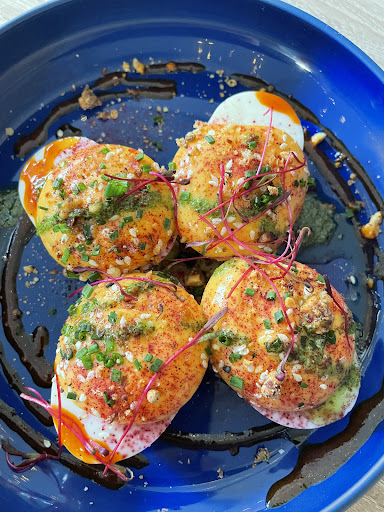 Ăa coche toutes les cases tout simplement comme le sont les propriĂ©taires et les serveuses. Ăa bosse dur et bien dans ce restaurant. Ils sont super sympathiques. Un peu de retard pour le service et bien ils nous ont offert les Ćufs mayonnaises qui ne se rĂ©sument pas à ça car ils sont excellents, Ă©lus les meilleurs Ćufs de BZH en 2022, rien que ça! Ensuite viennent les burgers vĂ©gĂ©tarien ou Ă lâeffilochĂ© de porc avec leurs pommes de terre grenailles, dĂ©licieux! GoĂ»tus, copieux, dĂ©licats⊠il nous restait un tout petit peu de place pour goĂ»ter les desserts (ou seulement de la gourmandise) et câest Ă©galement Ă la hauteur des plats prĂ©cĂ©dents. Nous nous sommes rĂ©galĂ©s dans un endroit cosy, chaleureux, une serveuse aux petits soins et trĂšs attentionnĂ©e. Une trĂšs belle surprise. Allez y les yeux fermĂ©s mais ouvrez les tout de mĂȘme pour apprĂ©cier la beautĂ© des assiettes et le tout pour une somme tout Ă fait convenable, 70 euros pour 3 avec lâapĂ©ritif, qui dit mieux?! HĂąte...