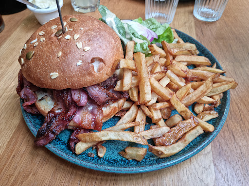 À l’arrivée, pas de blouse blanche de boucher, mais un tablier noir pour nappe blanche ? Sur la table piano, des burgers dodus, monstrueux, carnassiers, des Frankenstein de la bidoche, bourrés de sauce et d’audace que Chantal honnirait. Un anthropologue de passage pourrait croire à une étude de terrain : homo hamburgusrus dans son habitat naturel. Dress code ? Inutile. Le seul uniforme toléré, c’est la chemise tachée de ketchup. Les végans sont ici un peu comme les cheveux sur la « Houppe ».