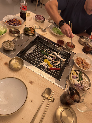 Une première pour nous dans ce restaurant. Nous avions déjà fait l’expérience d’un restaurant de barbecue coréen. Le concept est original ici, le restaurant est joli, épuré mais pas d’ambiance particulière ou de charme qui nous transporte en Asie.