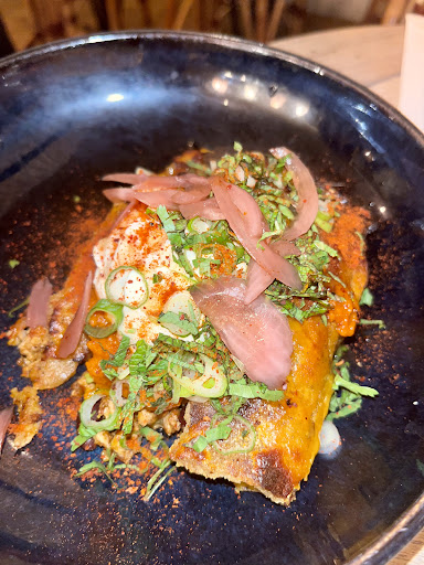 Food arrives- sushi was very good, interesting. Unfemiliar scents. Really, great dish. Second a yakitory skewer from local chicken with crunchy rice. Sauce was a touch too strong, chicken a touch too cooked but still, nice eating experience.
