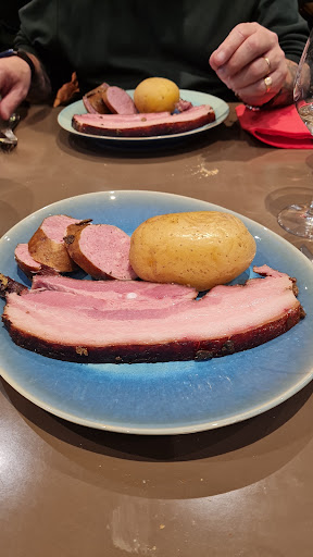 We were three English only speakers hoping for lunch and after checking a number of places which weren’t doing food during the off season we chanced upon this great place! Two of us had the daily three course menu which was very reasonably priced, and the local Jura wine which was delicious. The three course meal was celery soup with bone marrow, local tartiflette called morbiflette and pana cotta which all got rave reviews, for €17. The Jura white was very full bodied and aged in oak barrels for three years - they took the time to properly explain it to us! I’m a dairy-free vegetarian which is difficult in France, and when we asked if there was anything like salad or bread I could eat, they very generously offered to make an egg and potato salad just for me which was delicious - so very kind of them! They even spoke English to us which...
