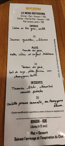 Read moreBoterzing( brasserie) : 4/5 Service irréprochable Cadre trÚs agréable Cuisine soignée, fraßche et maison Carte des biÚres variée et locale Petits bémols : rien de prévu au menu pour les végétariens. Carte des whiskys variée mais chÚre pour de l'entrée de gamme dans les bons whiskys