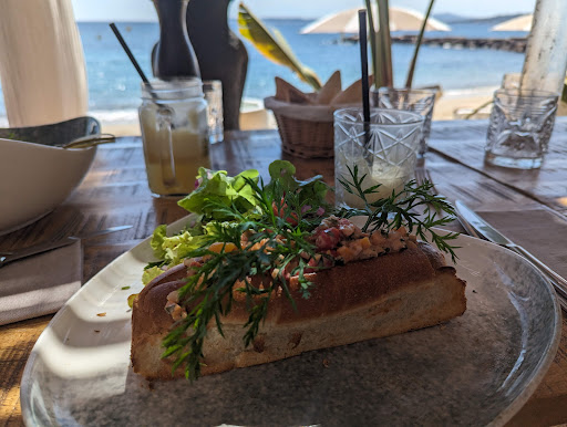 Read moreFairly classy restaurant/bar situated on the beach. They also rent umbrellas and beach loungers. We had excellent and fresh oysters (half shell) and mussels. DEFINITELY pass on the "Caesar salad" and don't miss the bizarre bathroom featuring neon lights, 99 cent store "Greco-Roman" busts, and cheesy fake flowers. In contrast to the breezy, casually chic Mediterranean feel of the restaurant/bar/private beach it is truly...