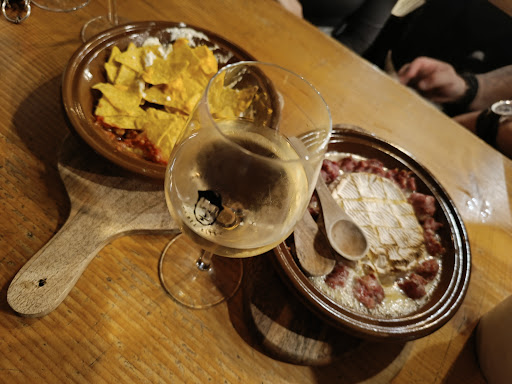 Le lieu est sympa et l'accueil aussi. On nous présente la carte avec pas mal de choix.👍 Pour la commande, mon époux voulais un whisky, réponse ça va être compliqué !? 🤔 Finalement verre de vin rouge et la proposition de 2 vin... Bref une fois le vin choisi, nous avons de quoi nous régaler 👍 planche mixte bien copieuse, un camembert rôti 😊 c'était très bon👍 Nous passons un agréable moment, on vient nous demander plusieurs fois si tout va bien 😊 Mon époux commande 2 autres verres de vin rouge... Réponse se ne sera pas le même car je ne peux pas ouvrir une autre bouteille 🤔 ok on prend celui ouvert... Qui n'a pas convaincu. (Dommage, affaire de goût certainement, mais il serait agréable de pouvoir vraiment choisir) Au moment de partir bien évidemment l'addition 😜 136€ pour 4. La qualité est là, déception pour le choix du vin rouge 🍷 par contre mon verre de blanc était excellent 👍 Et il est vrai comme écrit dans d'autres commentaires, il est facturé 10€ pour service à table, indiqué en salle à vous de choisir aussi puisque le client est informé 😉 Un peu mitigé, à refaire je pense.