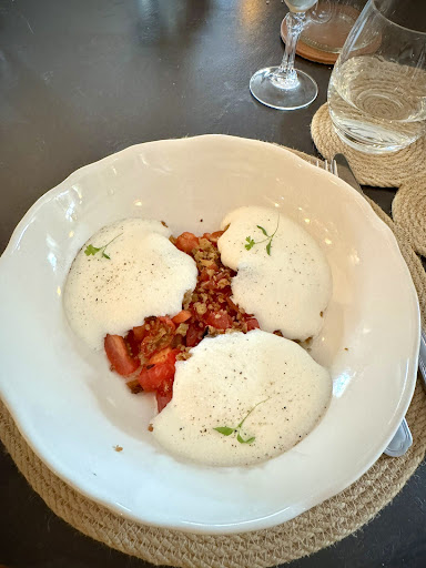 Charming location, delightful people, delicious food at a very reasonable price. Tasted the 35€ 3 course prix fixe menu and a few dishes from the a la carte menu. Classics like pate en croute or a creative version of insalata caprese featuring a light and tasty espuma of mozzarella were our favorite appetizers. Veal kidney with mustard sauce and stunning loup der mer soup showcased the chef’s regional experience and a perfectly cooked faux filet served with delicious jus and eggplant were highlights. Fun wine list composed of regional and french wines at low to medium prices. Excellent charming service with English and German language skills. Run by the dedicated owners. Indoor seating in a tiny rustic building and boho style outdoor dining area both very cosy. We‘ll definitiv come back next time...