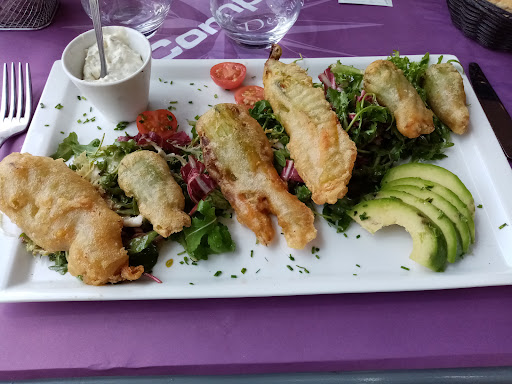 Concrètement, les beignets de courgette (commandés pour l’apéritif) sont arrivés 55mn après la prise de commande, et 30 secondes avant les plats… Après avoir plusieurs fois redemandé nos beignets de courgette (« ah oui le beignet… ça arrive je l’envoie »), la patronne nous a gratifié d’un « Oui ben y’a 50 couverts avant vous, faut attendre »… nous faisant porter la responsabilité de leur manque d’organisation. Précisons également qu’elle a passé une vingtaine de minutes à la table à côté à parler de la pluie et du beau temps avec d’autres clients, plutôt que d’assister son équipe visiblement en difficulté.
