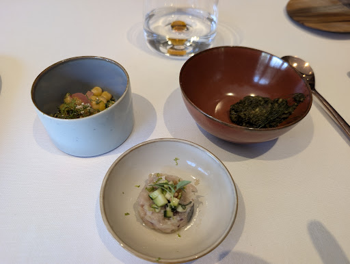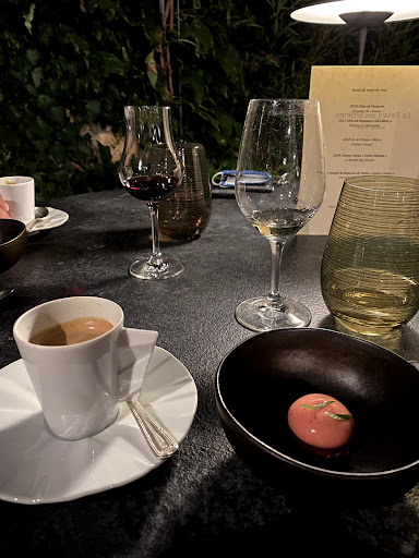 CIBO: in generale tutte le portate sono state buone ma non eccezionali. Inoltre è mancato uno story telling e personalità dello chef (che rispetto ad altri ristoranti stellati in cui siamo stati, non si è fatto vedere in sala). Abbiamo iniziato la cena con un aperitvo a base di champagne, gin e limone (buono) accompagnato da una espuma e un trancetto di sgombro (un pó troppo forte). Abbiamo poi optato per il menú degustazione da 88€ che prevedeva 4 portate (2 antipasti, 1 portata principale, 1 dolce). A mancare è stata principalmente la proteina: i due antipasti erano a base di sole verdure (buoni gli accostamenti ma piuttosto semplici). L’unica proteina è stato il tonno (il cui gusto era abbastanza forte) che peró aveva un retrogusto acetoso. Buono il dolce a base di cioccolato e nocciola, non ci ha colpito invece quello alla pesca.