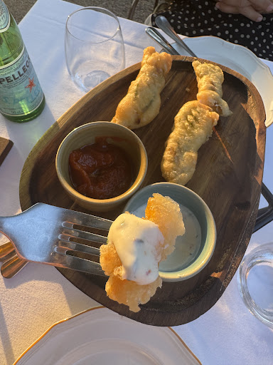 The menu showcases the best of the region. Zucchini flowers, fresh from the market, arrive delicately crisp with two flavorful homemade paired sauces. Main courses impress equally: a seasonal vegetarian pasta and sea bream with fennel and truffle polenta, both prepared with Michelin-level precision. Dessert, a bright and beautifully executed lemon creation, closes the meal on a note of pure Mediterranean sunshine.