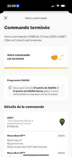 Read moreJ'ai fait une commande depuis l'application mcdo. J'arrive donc à 20h55 sur la place de parking dédiée aux commandes internet. D'après l'application ma commande est en préparation. Après 20min d'attente je décide d'aller voir la personne au guichet pour lui demander ou en est ma commande. Cette personne me répond sèchement que je dois attendre que ma commande va arriver... j'attend donc 10mins supplémentaire et vois que l'appli mcdo me dit que ma commande est prête et qu'on va me la déposer. Je suis donc patient et attend 10mins de plus mais toujours rien... je décide de retourner au guichet voir ce qu'il se passe. La dame regarde mon numéro de commande et va vérifier et me dit qu'ils n'ont jamais reçu ma commande et qu'il faut que je patiente quelques minutes le temps qu'ils me préparent ma commande. Forcément je me plains car c'est inadmissible d'attendre autant de temps pour finalement qu'on me dise d'attendre encore... et la dame toujours aussi aimable me dit que de toute façon je suis obligé d'attendre car ils ne peuvent pas me rembourser ma commande internet. Finalement 10mins après j'ai enfin ma commande de 36€30... 21h45 j'étais tellement pressé après avoir attendu 50mins que je n'ai pas vérifier si tout était dans le sac. J'aurai dû... Il me manquais 1 royal cheese et 1 mc flury donc en gros 30% de ma commande... Je n'irai plus jamais dans ce "fast"food car les problèmes dans mes commandes y sont...