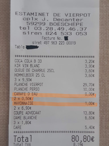 Read moreExpérience post confinement en terrasse. Quel bonheur ! Le lieu est plein de charme au pied du moulin , face au mont de Boeschepe, entouré de verdure et sans aucune voiture, ce qui permet de manger dans le calme et de laisser les enfants jouer sans aucun danger. Même s il y a eu quelques lenteurs de services et de disponibilités de plats, on pardonne complètement vue les conditions particulières de réouverture . Le principal est là, nous avons remarquablement mangé, avec mention excellent aux frites. Le menu propose peu de plats , ce qui garanti ici des produits frais, tous sont issus du terroirs. (Potje, fromage du mont des Cats, pâté et jambon maison). Un de mes garçons assez difficile s est régalé avec le pâté au point de manger la moitié du mien. Une performance rare réussie par le chef). Côté dessert, crêpes ou gauffres a la vergeoise blonde, brune ou cassonade. Pains perdu ,ou glace et café gourmand. Un choix pas immense mais une fois de plus qui fait honneur à la région. Le choix des bieres est bien plus grand, parmi d excellentes bière des Flandres et du Hainaut ( français et belge). Pour finir, un petit mot sur l'équipe du Vierpot, quelle gentillesse et quelle amabilité ! Des (jeunes) serveurs au patron, ils ont tous été attentionnés. On se sent comme à la maison, dans une ambiance détendue. Nous y retournerons donc...