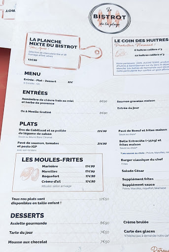 Read moreJ'ai eu plaisir de m'y installé avec un ami pour y déguster de délicieuses moules, au maroilles. Malgré l'affluence et l'absence de réservation, nous avons été chaleureusement accueilli avec sourire, à contrario avec les établissements voisins, dont cette indiscutable notion de base leur échappe cruellement. Sans hésitation, tout a été mis en œuvre pour nous installer en terrasse. La fraîcheur des moules, la générosité de la sauce, m'ont conquis. Je ne mange jamais de friture, c'est pourquoi, j'ai été "frustré" de la quantité servie. J'ai bien compris et je cautionne le refus au gaspillage. Cela n'impacte en rien ma satisfaction globale. Notre serveur "attitré", même semble t'il saisonnier, a su gérer son service et chose rare, lors du "coup de feu", n'a rien oublié lors de la mise en place. Bravo. Au moment de régler notre note, nous avons pu échanger avec le responsable des lieux, qui s'impose d'accorder à ses clients son précieux temps. D'une sympathie remarquable, sincère et non exclusivement à titre commercial. J'ai une maîtrise empirique pour en faire le distinguo. Dorénavant, nous ne courons plus les différents établissements. Le bistrot de la plage à su nous convaincre et obtient le titre de favori. Anecdote que Mr le responsable se souviendra ce jour là et dont il a su, avec bienveillance géré le comportement de clients irrespectueux. " Il est inconvenant d'une part, de s'installer à table sans en aviser le personnel et d'autre part, d'imposer la consommation de ses propres victuailles liquide ou solide. A très...