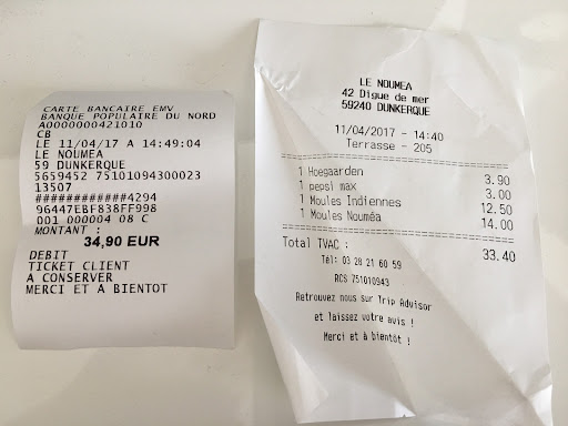 Read moreVOIR PHOTO - ATTENTION /!\ Escroquerie Je m'explique, il m'arrive souvent d’être sur Dunkerque. Je me restaure donc aussi souvent que mes déplacements me le demande dans des petits restaurant, chose que j'ai toujours fait, mais ... Ces derniers temps, j'ai remarqué qu'une fois sur deux, on me facture une boisson, un café, une petite chose qui peut, mauvaise foi oblige, s’apparenter à une petite erreur anodine, mais c'est une pratique vraiment honteuse qui se généralise dangereusement chez les restaurateurs de la cote... Et cette enseigne ne déroge pas à la règle... Je m'en suis rendu compte une fois chez moi à 400km de la... J'imagine que la tentation est grande, 1 ou 2 euros par client, sans compter le coup des "annulation de caisse" qui permet de retirer du liquide de sa caisse en le justifiant par un "remboursement client, invérifiable bref, c'est minable, mais multiplié par le nombre de tete à la journée... ça doit faire pas mal de liquide. J'ai fais le nécessaire, inutile de dire que j'ai abandonné l'idée de soutenir les commerçants de la cote. Pareil pour les autres restaurants, faut que je scan tous mes tickets de caisses mais j'ai fais le nécessaires aupres des autorités...