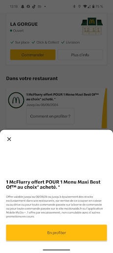 Offre valable jusqu'au 08/09/24 ou jusqu'à épuisement des stocks exclusivement dans vos restaurants, sur remise de ce coupon en caisse ou au drive ou pour toute commande passée sur la borne de commande ou pour toute commande passée sur le site mcdonalds.fr ou l'application Mobile McDo +. 1 offre par encaissement, non cumulable avec d'autres promotions en cours.