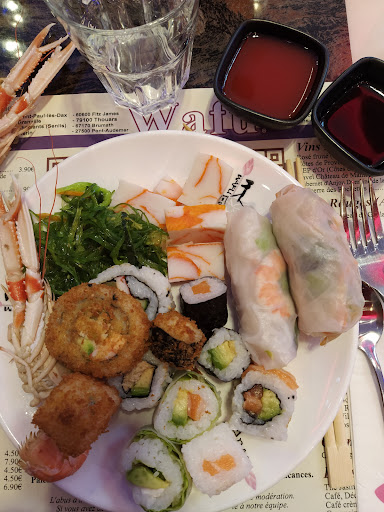 Read moreLe restaurant est très beau. La nourriture y est très variée, en quantité, et de très bonne qualité. Très large choix d'entrées : charcuterie, crudités, rillettes ... Buffet de sushis assez bien garni, et très bons. L'offre des plats est très grande : pinces de crabe, rouleaux de printemps, canard laqué, poulet curry, crevettes sauce piquante ... Vous pourrez choisir entre beaucoup de desserts : beaucoup de sortes de tartes, buffet de glaces, crêpes, verrines en tout genre (tiramisu, mousses, îles flottantes, crème anglaise ...) Un large choix de sauces est disponible. Buffet de fruits de mer, buffet de viandes (nous pouvons choisir le morceau de viande et le faire faire cuire selon nos goûts). Chips de crevette (il me semble) offerte à l'arrivée. A la fin du repas on vous propose du saké et des serviettes humides chaudes très agréable. Nous regretterons cependant le fait que dès lors que votre assiette est vide on vous la retire très rapidement ... ainsi que quand on commande de l'eau on ne nous la délivre pas si on n'insiste pas plusieurs fois, par contre les boissons payantes sont données de suite ... Nous avons été étonnés de la différence des prix pour le buffet à volonté : 12,90€ la semaine, 19€ le week end, jours fériés et le soir. Sinon absolument rien à redire,...
