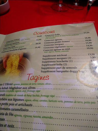 Première fois à l Olivier du Maroc, invitée dans le cadre d un anniversaire par des proches amis. Un samedi midi, le restaurant est quasiment complet, il vaut mieux réserver ou bien arriver de bonne heure. Ce qui peut être de bonne augure. Une grande table dressée pour une quinzaine de personnes nous attend dans un coin du restaurant. Les serveurs sont souriants, et s activement entre les tables. Nous commençons par un apéritif et nous commandons en même temps les plats. Choix entre couscous royal, brochettes, poulet, et tajines agneau aux poires, miel, amandes, c est assez alléchant. Sur la carte, je trouve couscous végétarien, du coup je passe commande. Mon plat arrive, une bonne dose de semoule, que je trouve pour ma part un peu trop salée, et ensuite plus rien. En fait, les légumes j ai du les prendre sur le plat du couscous commandé par les autres invités. Pour 14 euros 60, je trouve cher l assiette de semoule. Quand aux légumes pas trop de variétés, le bouillon pour moi manquait de saveur. Par contre, les tajines commandés, très copieux, semoule servie en forme de pyramide, très original. Le service impeccable, dommage qu il faille demander de la semoule et de la garniture à chaque fois. Ambiance joyeuse, la décoration un peu vieillotte, la vaisselle typique très jolie. La banquette confortable mais attention aux taches. Je vous recommande le boulaouane rosé, très bon vin, bien frais. Pour ceux qui n ont pas réussi à finir leur plat, une petite boîte offerte pour ramener les restes, ainsi que les bouteilles de vin non finies. C est à souligner, car beaucoup de restaurants ne le font pas. C'est une très délicate attention. Malheureusement, je n ai mis que 3 étoiles, mon couscous végétarien, rien d extraordinaire, et être obligée par 2 fois de réclamer semoule et légumes ça ne...
