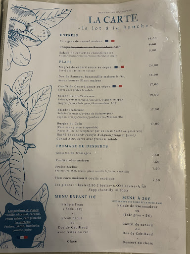 En premier lieu il s'agissait de trouver un restaurant ouvert lundi soir à Saint Céré dans le Lot... Le Lot à la bouche était ouvert, le carte alléchante pour des prix corrects. Nous avons pris le magret de canard sauce aux cèpes, frites et salade... Le magret parfaitement cuit et généreux, la sauce goûteuse mais sans morceaux de cèpes, les frites dorées juste comme il faut, pour la salade la sauce mériterait à n'être qu'une cuillère d'huile de colza ou pépins de raisin et une cuillère de vinaigre de vin pour apprécier le croquant des jeunes pousses. Nous avons également testé le confit de canard avec les frites et salade... Le confit était très bien servi bien qu'un peu ferme à mon goût, pour les frites et salade même commentaire. Suivi de profiteroles très généreuses et une coupe de glace chantilly bien appréciée. Service impeccable de Louise agréable et souriante. Merci au jeune Chef pour sa cuisine. Une belle soirée pour un dîner imprévu....