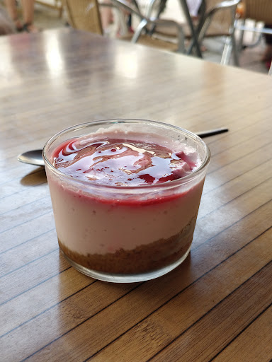 Read moreWe kwamen een beetje laat aan in Florac voor de lunch. We hadden iets kleins gegeten bij de buren maar zagen de mooi opgemaakte borden van Au Pecher Mignon. Op het zonnescherm zagen we "creperie" en we dachten dat het een bar was voor zoetigheden: pannenkoeken, ijsjes, misschien wafels,... Vandaar dat we eerst naar de buren gingen. Het was al ruim na 14.30u en de keuken was eigenlijk al gesloten. De eigenaar was super vriendelijk en wilde ons als laatste tafeltje toch nog helpen. Gelukkig! We bestelden de vegetarische "gallette du jour": de helft bospaddenstoelen in groene roomsaus en de helft groenten curry met kokos. Daarbovenop enkele plakjes reblouchon of raclette of zo. Heerlijk! Onze zoon had niet zo'n zin in groenten en kreeg een kaaspannekoek. Het barretje heeft self-service. Je moet zelf je bestek pakken, zelf je drinken uit de koelkast halen en zelf je biertjes of cider tappen. Ik zag de bierglazen niet direct en wist niet dat de cider in keramieken bolletjes moest, dus ik gebruikte de veel te grote Perrier glazen 🙈. De toetjes kun je ook zelf pakken: 5 verschillende soorten huisgemaakte triffle/cheesecake. Wij hadden de speculoos/witte chocola/ frambozen uitgekozen. Heerlijk, voor slechts 4 euro! Sowieso, alles had een heel redelijke prijs: 12 euro voor een grote gallette met rijke vulling. Ook de gallettes met vlees of vis hadden deze prijs. Dit is een aanrader als je naar Florac gaat. Heerlijk eten en super aardige...