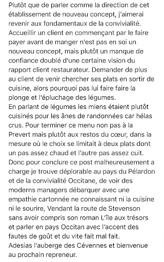 Read morePlutôt que de parler comme la direction de cet établissement de nouveau concept, j’aimerai revenir aux fondamentaux de la convivialité. Accueillir un client en commençant par le faire payer avant de manger n’est pas en soi un nouveau concept, mais plutôt un manque de confiance doublé d’une certaine vision du rapport client restaurateur. Demander de plus au client de venir chercher ses plats en sortir de cuisine, alors pourquoi pas lui faire faire la plonge et l’épluchage des légumes. En parlant de légumes les miens étaient plutôt cuisinés pour les ânes de randonnées car hélas crus. Pour terminer ce menu non pas à la Prevert mais plutôt aux restos du cœur, dans la mesure où le choix se limitait à deux plats dont un pas assez chaud et l’autre pas assez cuit. Donc pour conclure ce post malheureusement a charge je trouve déplorable au pays du Pélardon et de la convivialité Occitane, de voir des moderns managers débarquer avec une empathie cartonnée ne connaissant ni la cuisine ni le sourire, Vendant la route de Stevenson sans avoir compris son roman L’île aux trésors et parler en pays Occitan avec l’accent des fautes de goût et du vite fait mal fait. Adesias l’auberge des Cévennes et bienvenue au prochain repreneur.