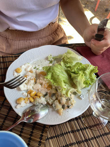 Found by chance while entering the village of Florac, you stumble upon a pleasant terrace covered with an incredible vine that has grown and provides shade for the outdoor terrace of this restaurant, Chez les Paysans. A pleasant and friendly welcome from the staff brings a smile to your face as you prepare for a meal that will delight your taste buds with its various dishes, like a history book of this beautiful region of the Cévennes. For my part, a local dish: stuffed pork belly sautéed in duck fat and a Parmentier gratin with nutmeg cream. More than a treat, I would have happily ordered a second. Then came a Cévennes blueberry tart, and for my part, a little extra special order: coffee in a large cup, served with a scoop of chocolate ice cream placed inside and topped with whipped cream, just like I like to enjoy in Germany. Before leaving this pleasant place, don't forget to consult this lovely book Si les Cevennes m'étais contées... a magnificent book with superb drawn images. It is obvious that through the welcome, the service, and the chef's cuisine, I particularly recommend this restaurant and its lovely shop. Thank you again for this...