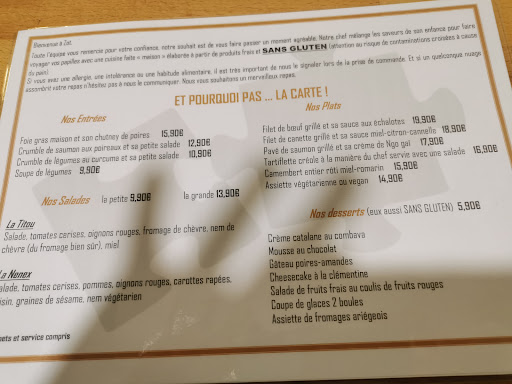 Read moreAttirés par les photos, les critiques et les notes, nous y sommes allés ce samedi midi. PAS DÉÇUS !! C'était génial ! Je recommande vivement. Personnel agréable et de bons conseils (une apprentie était présente coachée par la serveuse). Carte simple mais produits de saison et TOUT FAIT MAISON. Plats bien garnis avec en accompagnement riz ou frites et légumes. Le saumon et la cannette étaient succulents. Le foie gras maison en entrée : une tuerie ! (bien obligé à Foix 🤣). En dessert gâteau poire amandes pas trop sucré juste comme il faut. Carte de vins bien fournie. Jus de pomme bio. Thés et cafés de qualité de bon ton...