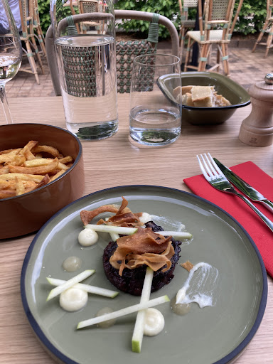Nice setting, good service and tasty food. But… The portion sizes of the main dishes are tiny. Like tapas or starters- nouvelle cuisine at its prettiest but least filling. In reality you need to order 2 or 3 plats at €9-12 each, plus one or two side dishes (which are more normally sized and good value at €4). My boudin noir was to be served with parsnips and ‘granny smith’. But it was a single slice of boudin, some julienne slivers of Granny Smith, a few parsnip crisps and some puréed blobs of baby food that were unrecognisable. Pretty and tasty but not satisfying. The wine was good but started at €5 a glass (fine) but no carafes/ pichets (disappointing). So all in all, nice setting, nice staff, tasty but very dainty food. But anticipate at least € 50 a head for a satisfying meal. To be fair the waitress did ask me if everything was okay - well I was enjoying it so I said yes. I don’t think my review is unfair because if she had asked me if I thought the offer overall was good I would have given the above view. Maybe just put a note on the menu/ web site explaining the plats are child sized and ordering several is...