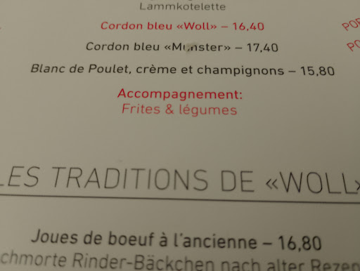 Read moreDer "Woll" ist im Saarland eine Institution. Dennoch war ich viele Jahre nicht mehr dort - es hat sich einfach nicht ergeben. Inhaber des Hauses ist inzwischen ein großer lokaler Fleischwarenhändler. Innerhalb kurzer Zeit waren wir einmal mit einem befreundeten Paar zum Abendessen dort, einmal wir beide zum Mittagessen. Vorweg - es empfiehlt sich die Reservierung, die sowohl per Homepage als auch per Telefon natürlich komplikationslos möglich ist. Bei beiden Besuchen war das Lokal mehr als gut besucht. Leider war es witterungsbedingt noch nicht möglich draußen im Garten mit herrlichem Blick über Saarbrücken und die Spicherer Höhen zu sitzen. Dort gibt es übrigens auch Spielmöglichkeiten für Kinder und Enkel! Die in den Bewertungen öfters beklagte unaufmerksame und unfreundliche Bedienung kann ich überhaupt nicht bestätigen! Trotz Hochbetrieb schnell, freundlich und aufmerksam. Die angebotenen Speisen sind keine haute cuisine! Dazu sollte man ein paar Kilometer weiter fahren. Aber sie sind bodenständig mit Tendenz zum feineren Essen, gut zubereitet und schmackhaft. Ich empfehle die Froschschenkel - ein Klassiker - und das Cordon bleu mit Münsterkäse. Dazu ein frisches Bier oder ein viertel Wein aus der für die Lokalität ausreichend dimensionierten Weinkarte und man ist nach dem Essen satt, zufrieden und ist überzeugt, gut und schmackhaft gegessen zu haben. Fazit - wir kommen bald wieder. Dann hoffentlich mit Essen im Freien...