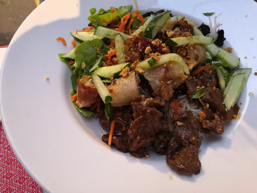 Service was very warm and friendly and the food is fresh and delicious! The seafood starter salad was a treat and their nems (spring rolls) are bomb 🔥🔥