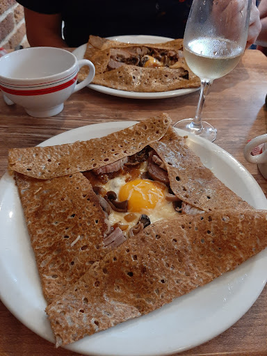 Saturday lunchtime. Freshly cooked gallette, super complete, plus crepe, brioche perdu, washed down with cider, followed by coffee.Green salad and fries. Excellent service, all food cooked freshly. Not sure what is going on in France with fries. What once were crisp are now soggy.